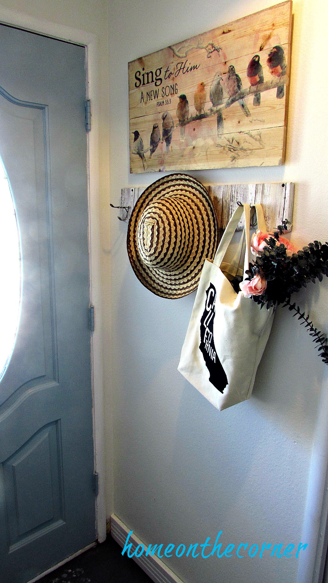 painted entryway wooden coat rack with hat and flowers Previous Next Published April 24, 2017 at 1080 × 1920 in Entryway Reveal-Before and After