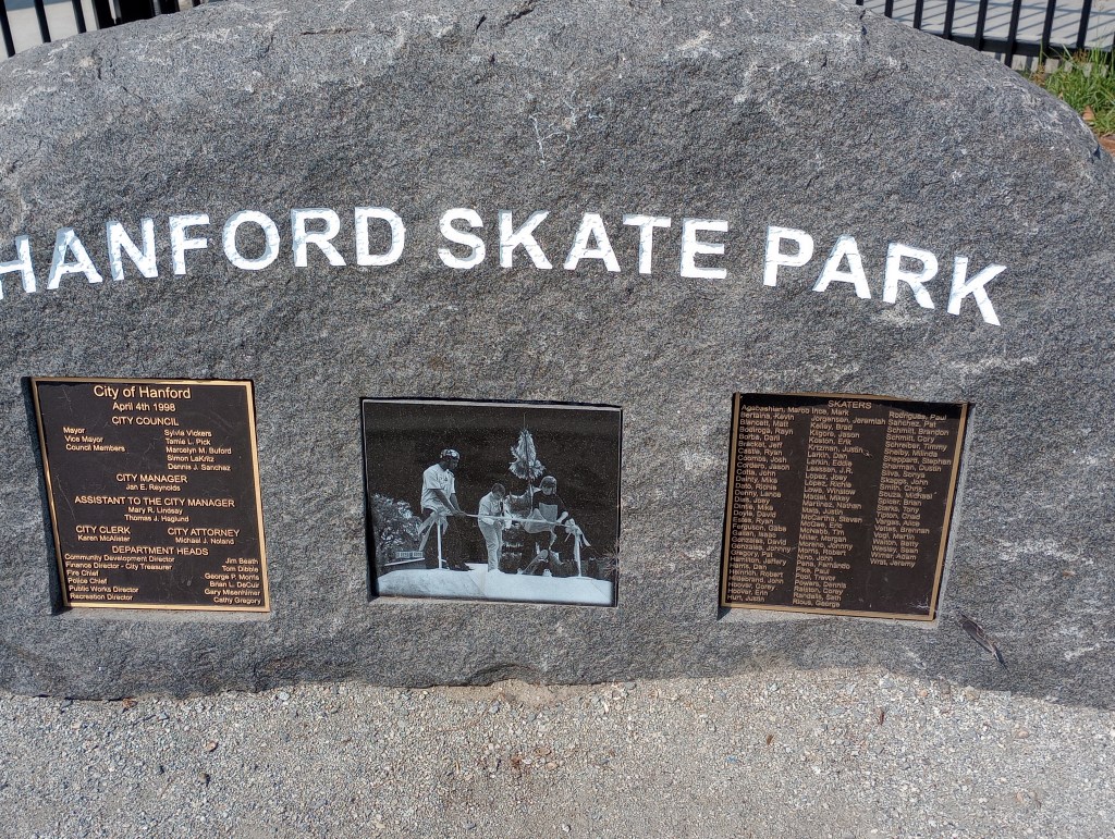 The Hanford Skate Park is right next to the pool, in case you get too warm while skating!. The skate park was opened in 1997. I remember it being quite a big deal at the time.